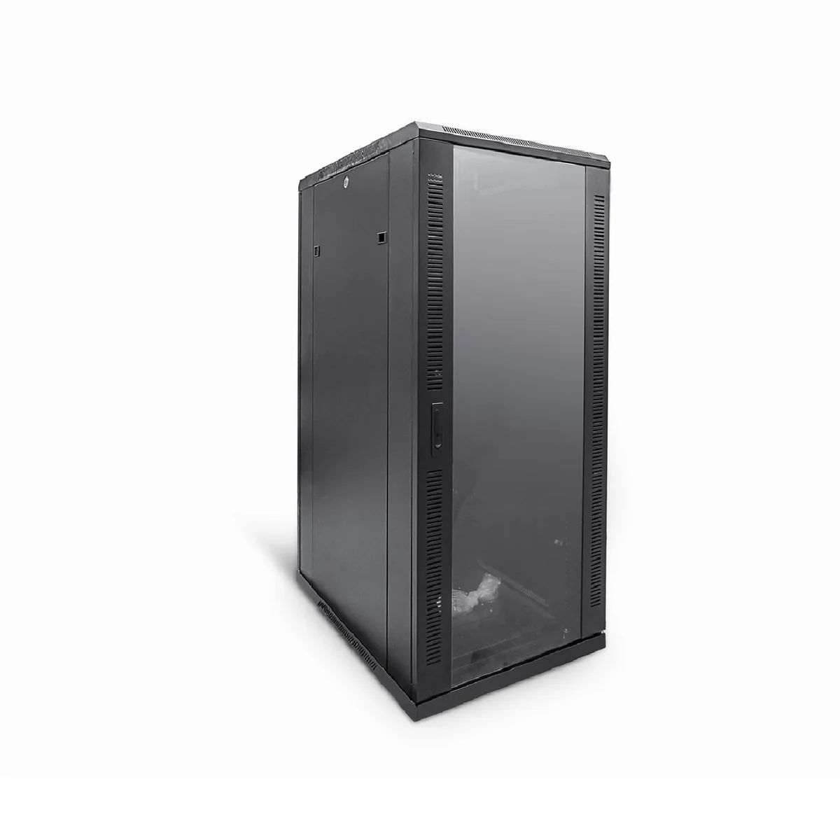 Constructed with a durable steel frame and finished in a robust black powder coating (RAL 9005), this floor standing server cabinet offers long-term performance and protection. It includes essential accessories such as a fan tray, vented shelf, castors, and adjustable levelling feet for easy installation and mobility.